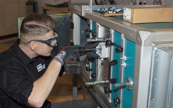 Die Lüftungsanlagenbauer/-innen bauen eine Anlage rund um ein Luftaufbereitungsgerät. Dieses Bauteil sorgt dafür, dass Luft gefiltert, erwärmt, gekühlt oder entfeuchtet wird. Dafür erstellen die Teilnehmenden eine Halterung, schneiden Lüftungsrohre zu, verbinden diese mit Kanälen und montieren passende Formstücke. Zusätzlich bauen sie Regelgeräte zur Steuerung der Luft sowie Kontrolldeckel ein, mit denen die Anlage gereinigt und überprüft werden kann. Am Ende muss das System dicht, funktionstüchtig und sauber verarbeitet sein.