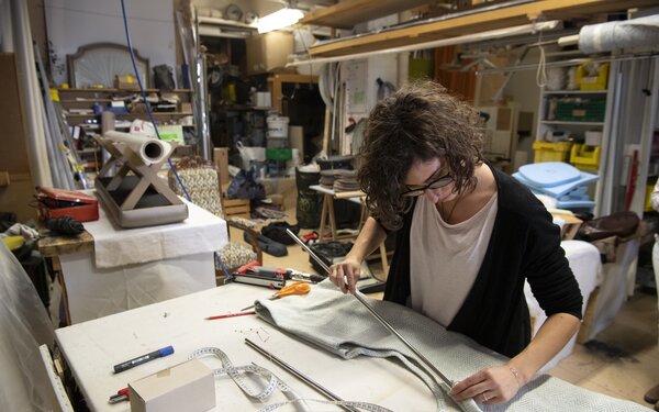 - AufgabeIn Zweiergruppen gestalten die Raumausstatter/-innen das Grundgerüst eines kleinen Bistros. Sie beziehen Wände mit Stoff und Akustikpaneelen, verlegen Teppichboden, montieren Lampen und polstern Möbel. Ihre Arbeit schafft die Basis, auf der die Wohntextilgestalter/-innen das Ambiente vollenden.